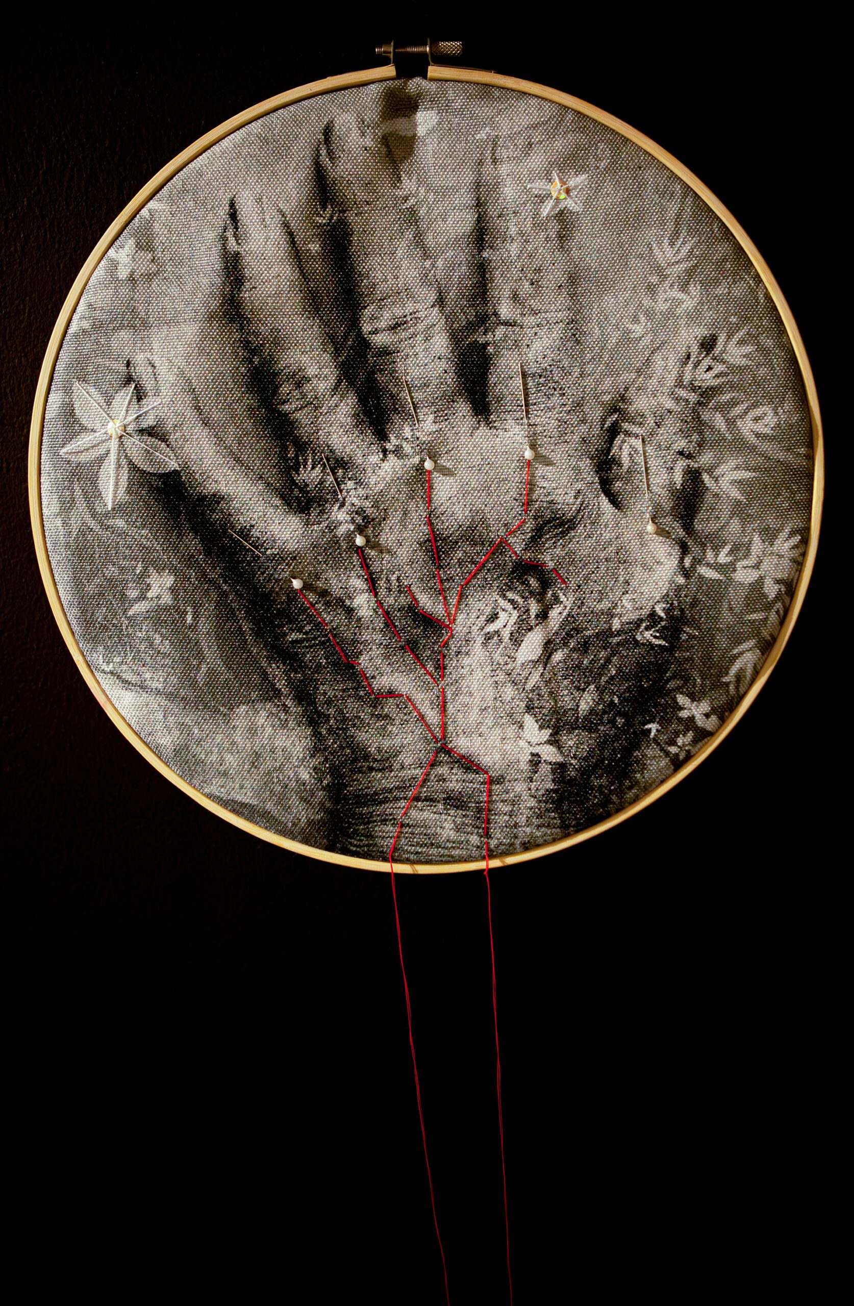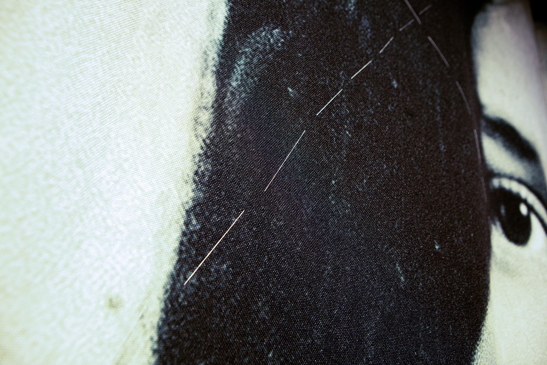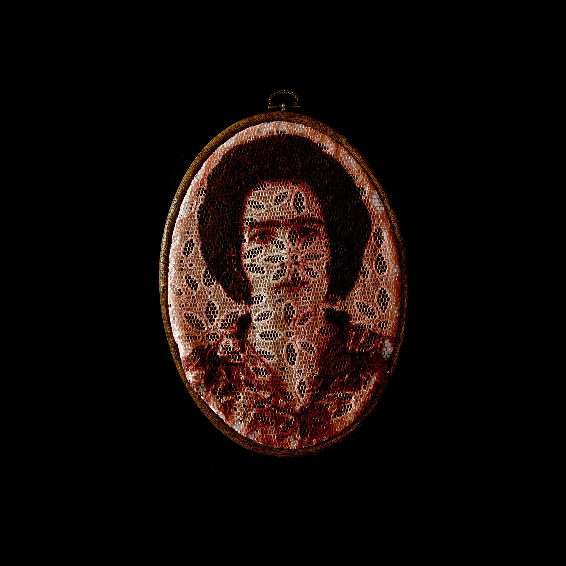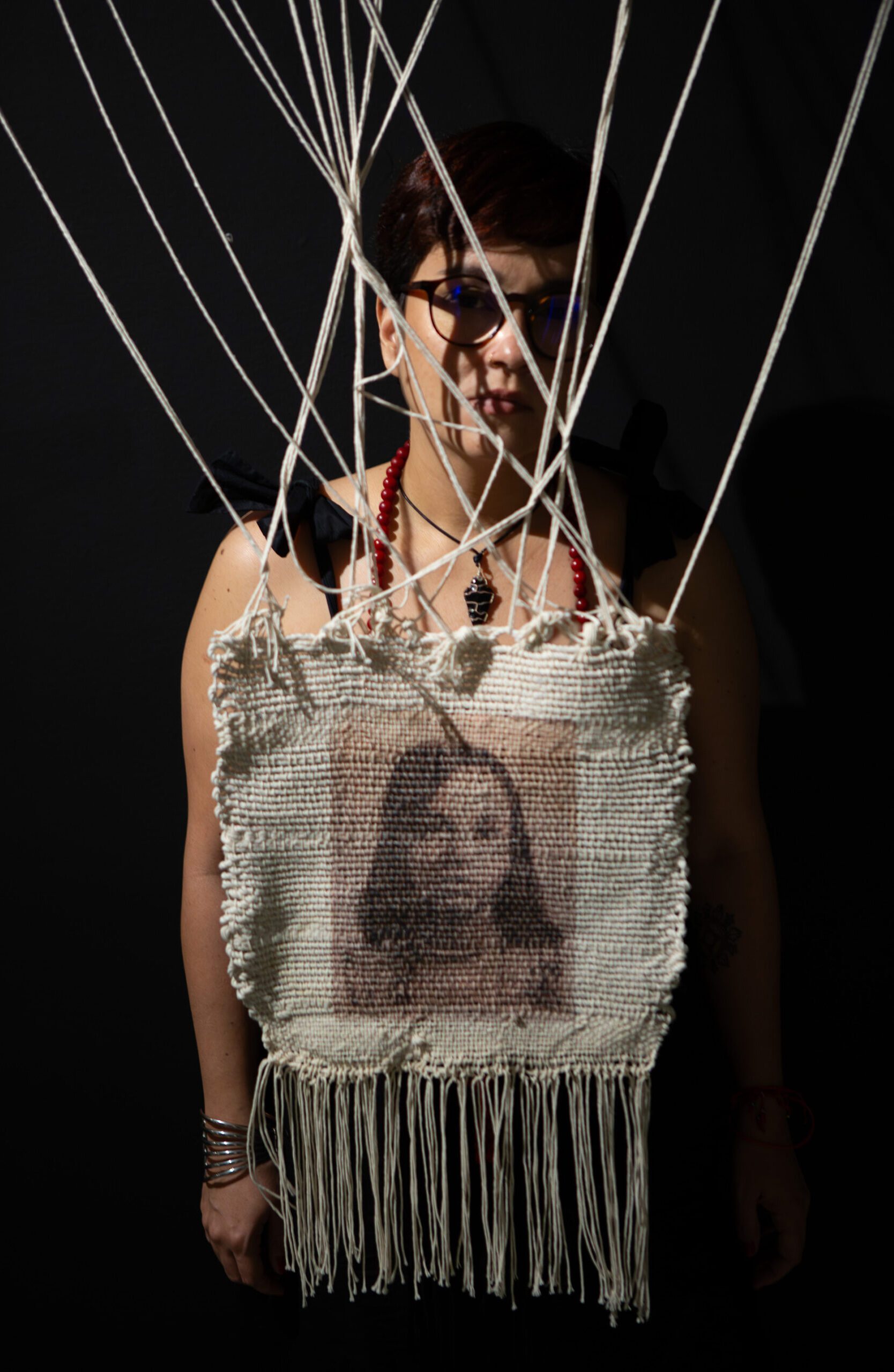 Sentí la ausencia de mi madre a muy temprana edad, aquí me permito explorar esta ausencia materna en mi vida a través de una foto de carné de ella que paso a soportes textiles y la intervengo juntando su rostro con el mío. Aquí, me busco a mi misma a través de su rostro y sus manos de mujer costurera.
